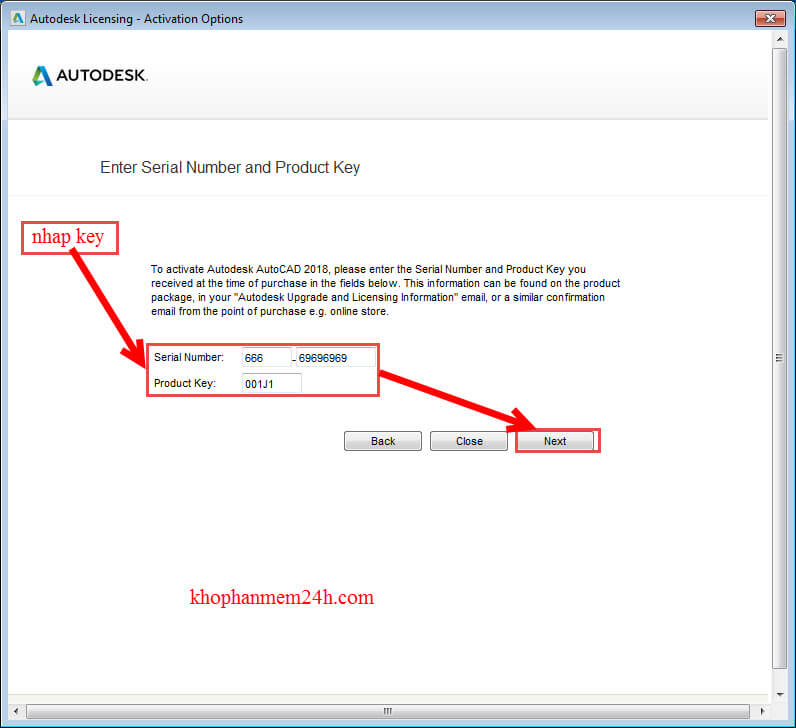 Bước 4: Nhâp Serial Number: 666 – 69696969 và product key autocad 2018 : 001J1