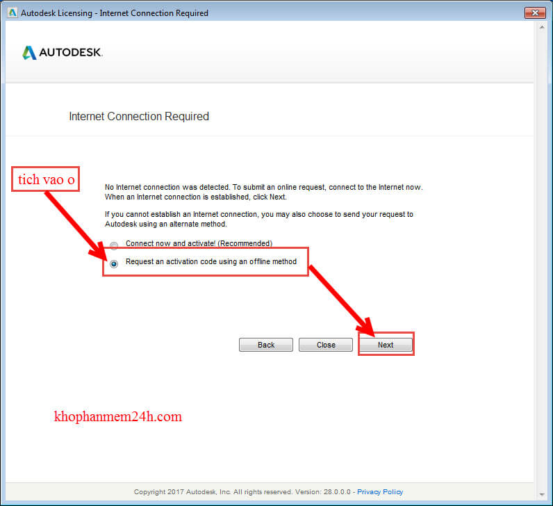 Bước 5: Tích vào ô “Request an activation code using an offine method” rồi chọn “Next”