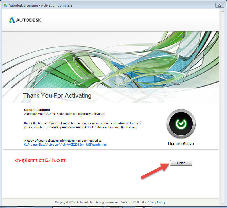 Bước 9: Xuất hiện như hình dưới là đã active autocad thành công. Chọn Finish để kết thúc.