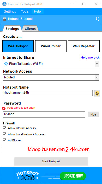 Bước 5: Nhấn “Start Hotspot” để bắt đầu sử dụng Connectify Hotspot.