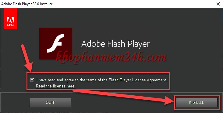 Bước 3: Chọn I have read and agree to the terms of the Flash Player License Agreement. Sau đó chọn Install để bắt đầu quá trình cài Adobe Flash Player.