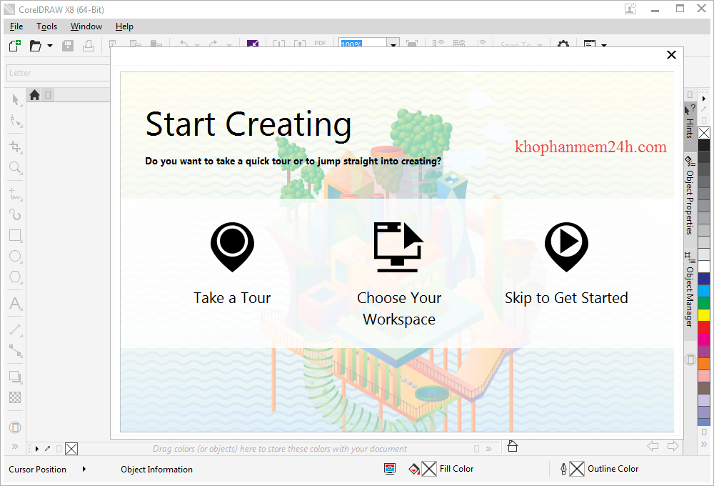 Sau khi cài đặt xong, giao diện sẽ hiện thế này. Việc còn lại chỉ là tận hưởng thôi. Bộ cài CorelDraw X8 full crack này đã active sẵn theo key nhé.