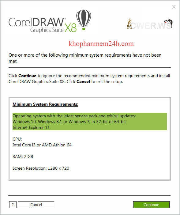 Bước 2: Màn hình sẽ hiển thị yêu cầu tối thiểu để cài đặt Corel X8 portable fshare, bạn chỉ việc nhấn Continue