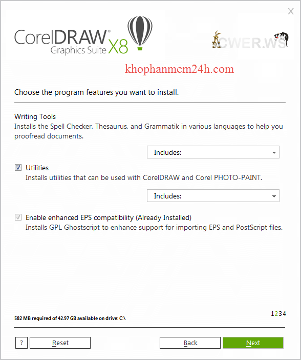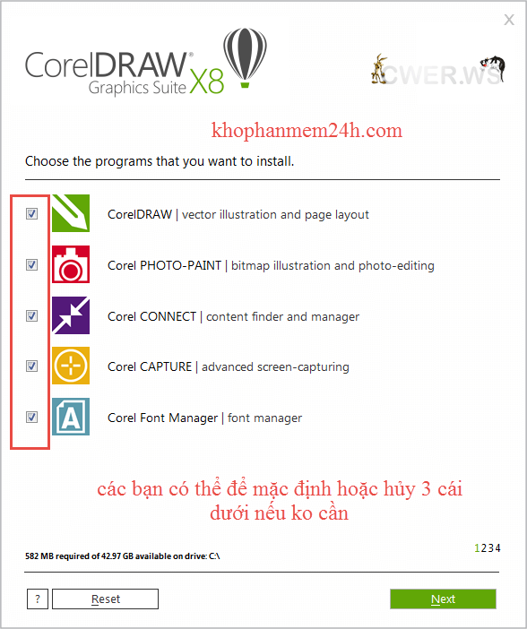 Bước 6: Có thể tùy chỉnh bỏ hay ko bỏ các ứng dụng của bộ Corel X8 portable fshare, ở đây mình để vậy