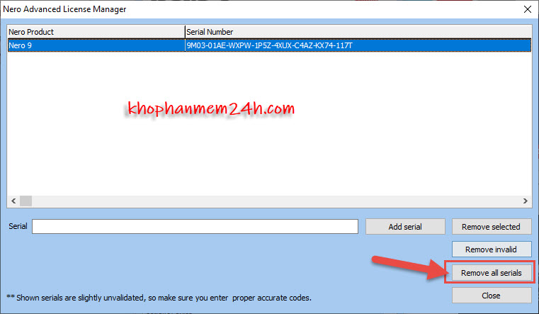 Bước 3: Chọn Remove all serials sau đó chọn close