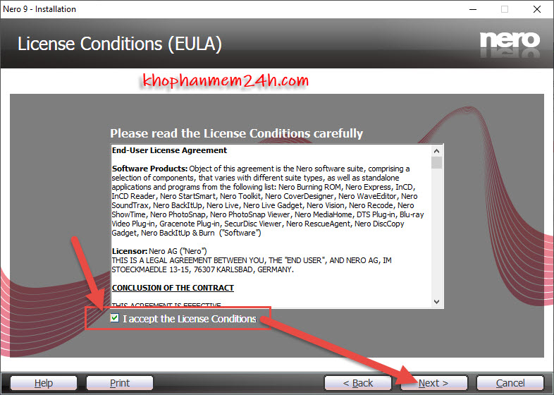 Bước 6: tích vào ô “I accept the License Conditions” rồi chọn Next
