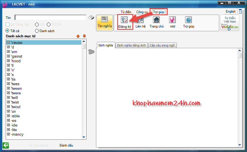 Bước 4: Mở phần mềm lạc việt mtd lên vào phần trợ giúp rồi chọn Đăng ký bằng key ở bước 3