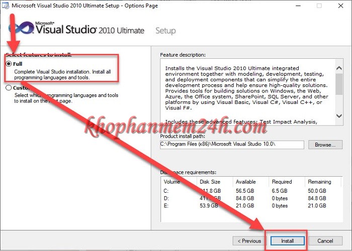 Bước 4: Sau đó, bạn chọn ‘Full’ và chọn nơi lưu trữ File Virsual Studio 2010, nhấn “Install” để cài đặt.