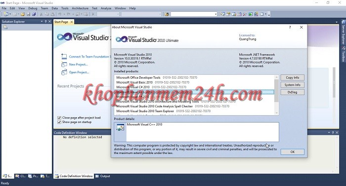 Sau khi cài xong bạn chỉ việc sử dụng visual studio 2010 mà không cần phải mua key Visual Studio 2010 Ultimate nhé.